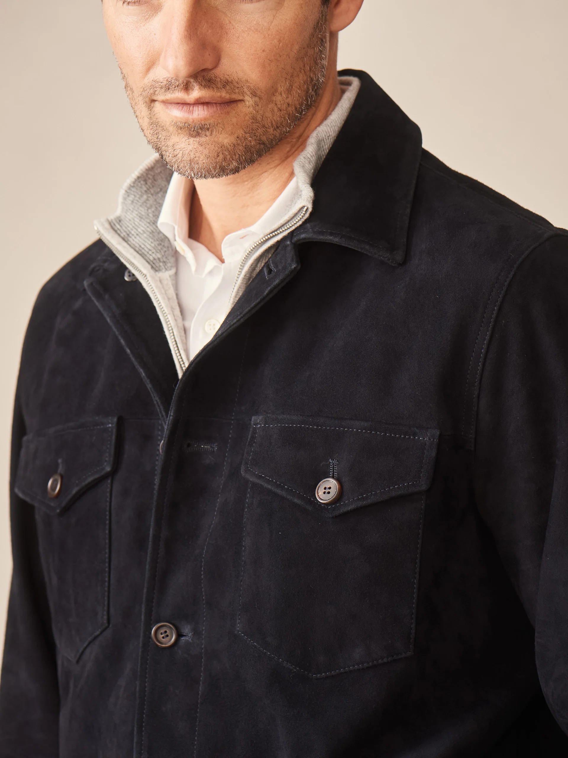 A practical layer made from a sumptuous Italian goat suede. Features two button-through pockets at the chest and two slash pockets at the waist.